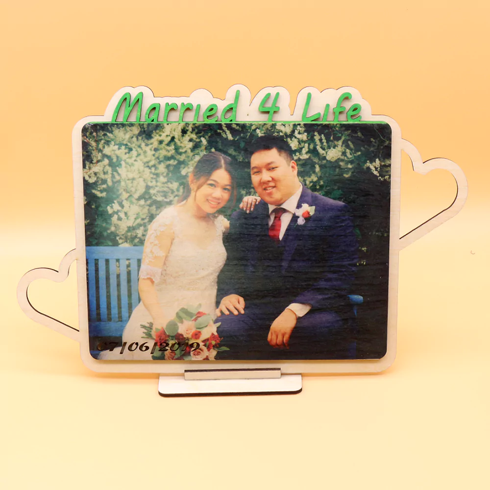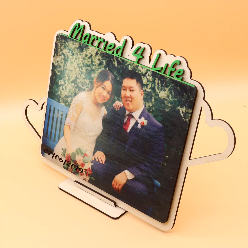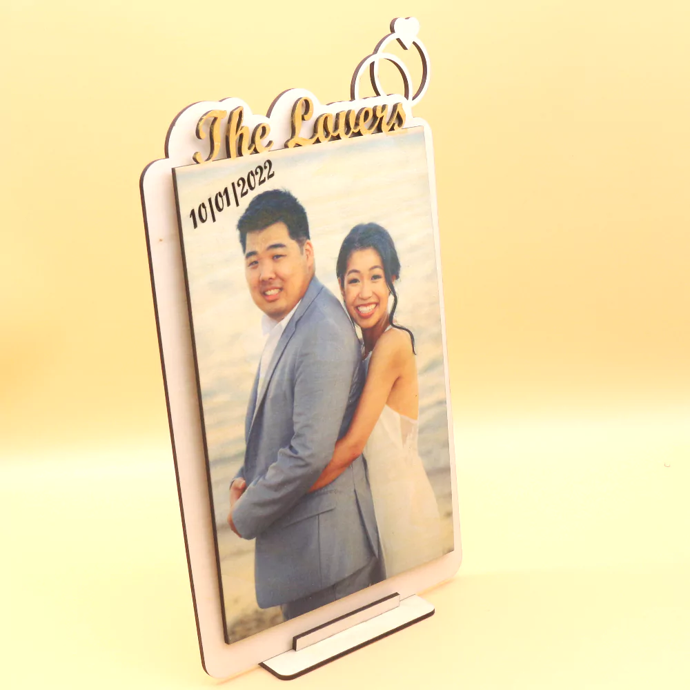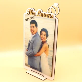 Based on your words (English OR Traditional Chinese) and/or the content of photo, our designers will design the frame with different elements (like rings or hearts, for a wedding picture). This piece comes with a stand.
